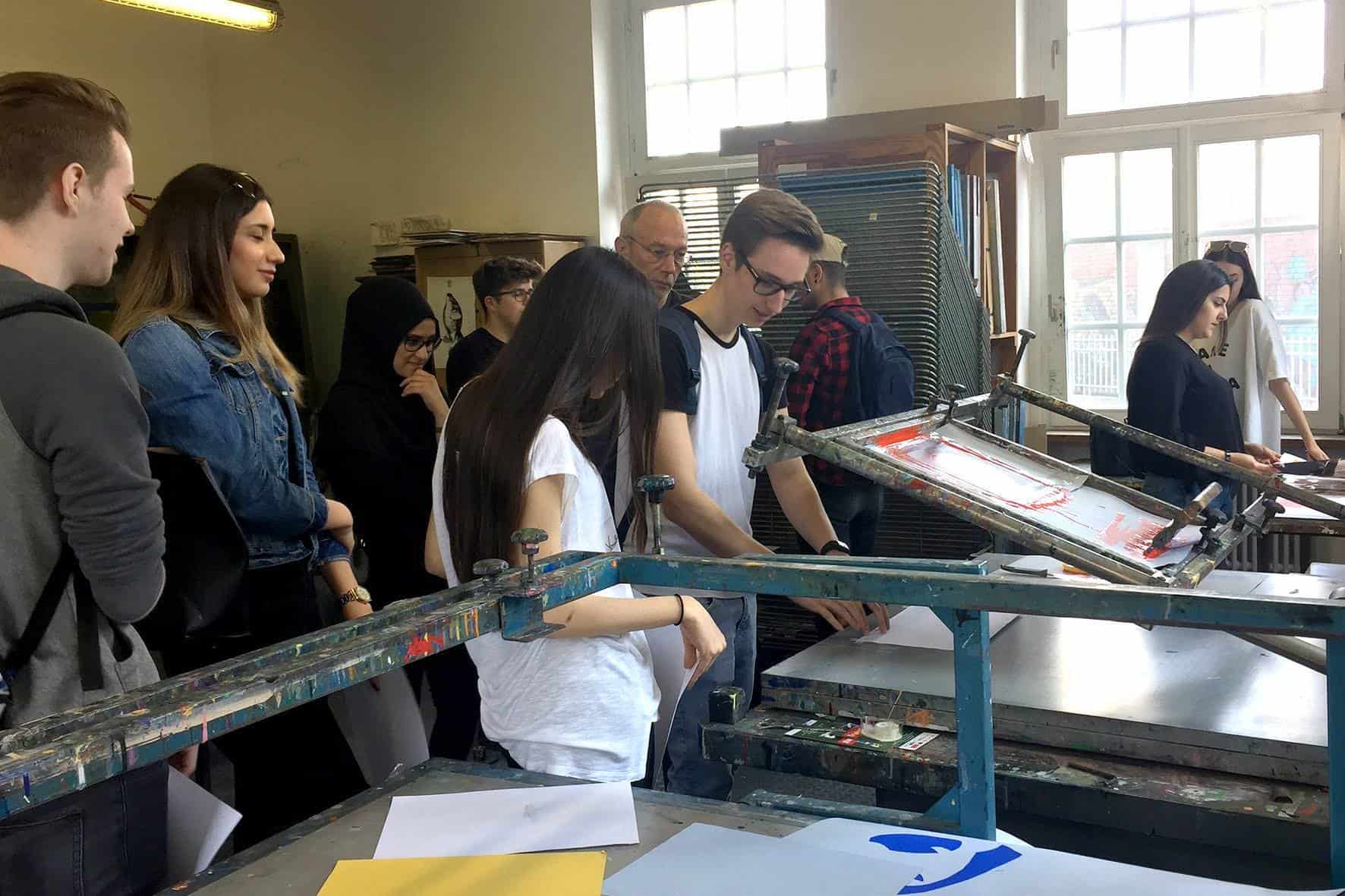 Am 22. Mai 2017 war es wieder soweit. Die beiden Medien-Unterstufen machten sich mit Frau Grandt auf zum Druckworkshop, bei dem sie in inspirierender Atmosphäre von professionellen Bildenden Künstlern die Techniken zu Holz-/Linolschnitt, Radierung, Lithografie und Siebdruck praxisnah erläutert bekamen. Im Anschluss durften sie sich auch selbst im Siebdruck versuchen … mit ganz ansehnlichen Ergebnissen!
